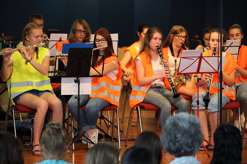 Unter der Leitung von Frank Hahnhaußen lieferten die 9 Sängerinnen sowie die 17 Combo-MusikerInnen einen souveränen Auftritt. Insbesondere die verschiedenen Versionen zum Text „Ich fühle tief in meinem Herzen“ fanden großen Anklang beim Publikum, sodass Moderatorin Eva Molter, Projektleiterin der Landesakademie, als Zugabe „nochmal den Schlager“ hören wollte.