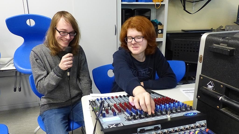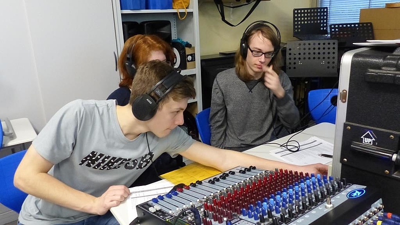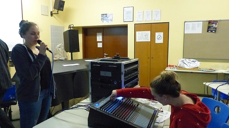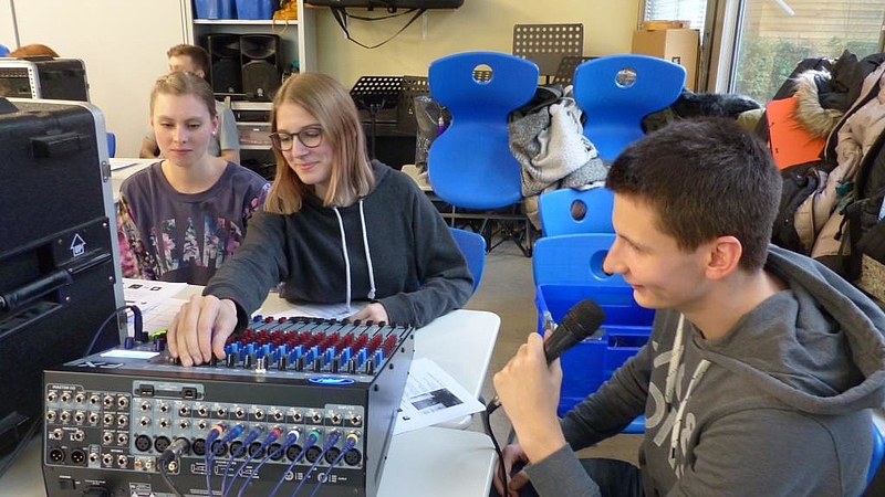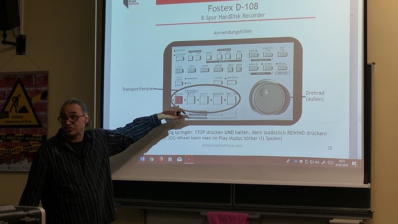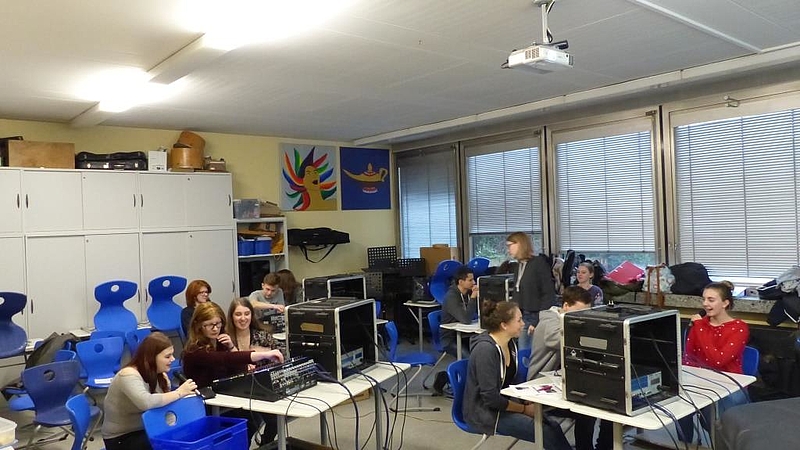 Walter Hauschild, Leiter der „Abbey Road Class Room Sessions“, informierte die Schülerinnen und Schüler nicht nur über die Abläufe der Songproduktion, die Funktionsweisen des Mischpults und die typischen Soundeigenschaften verschiedener Musikstile, sondern brachte auch umfangreiches Equipment mit, an welchem sich die Arbeitsgruppen im Audio-Mastering üben konnten.