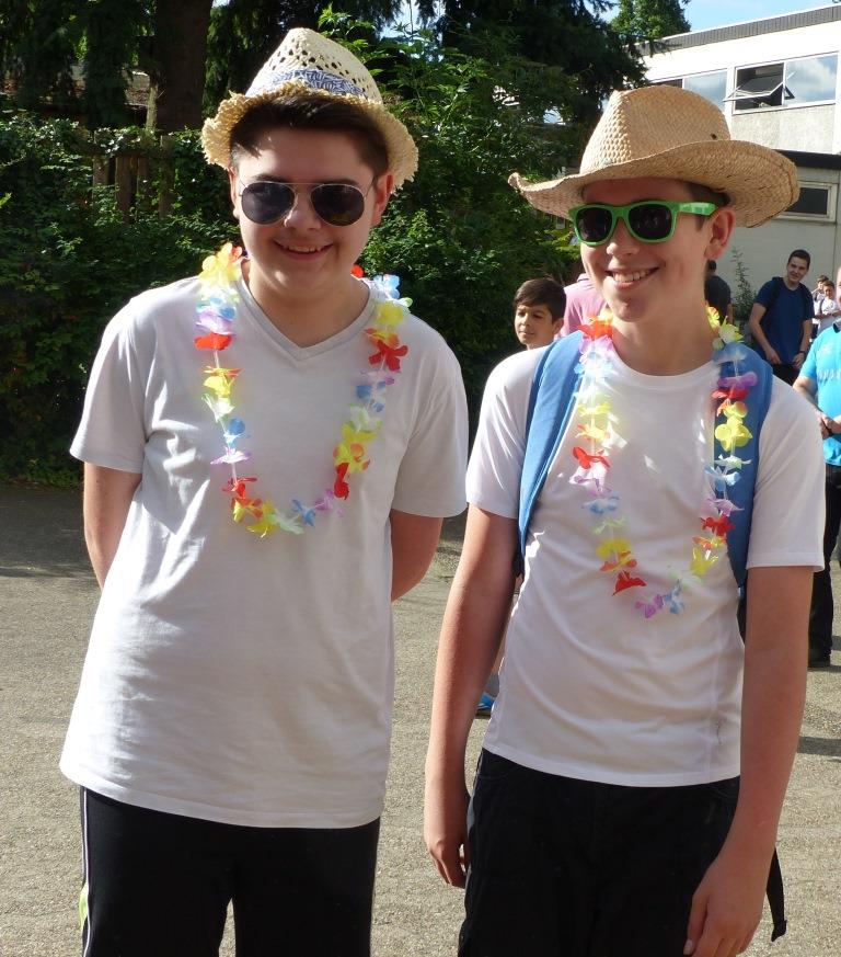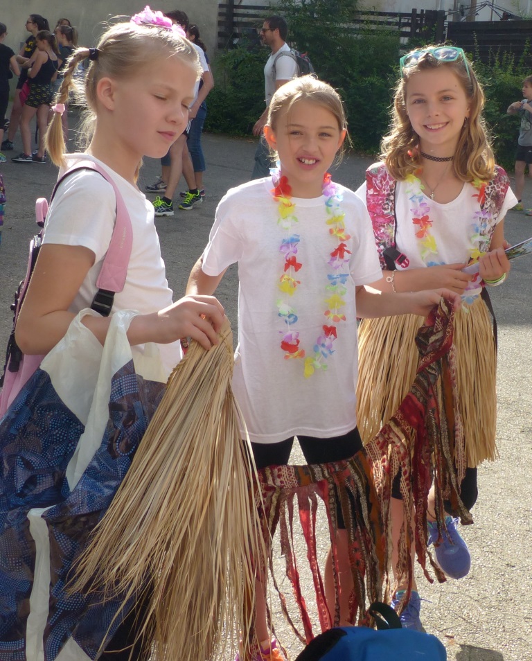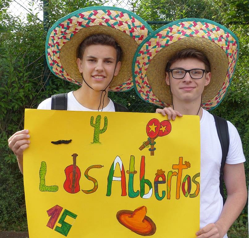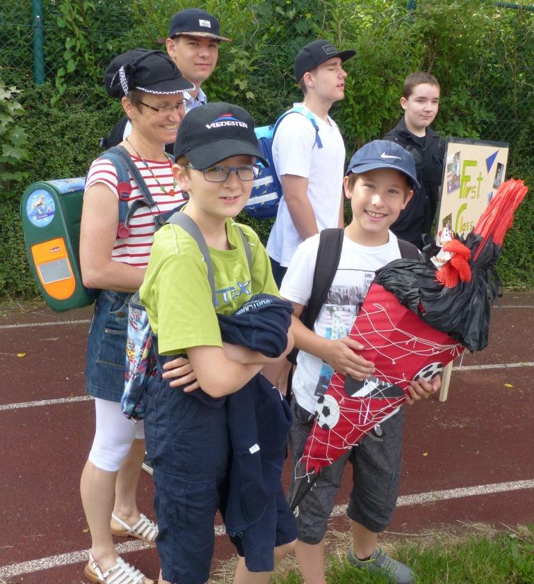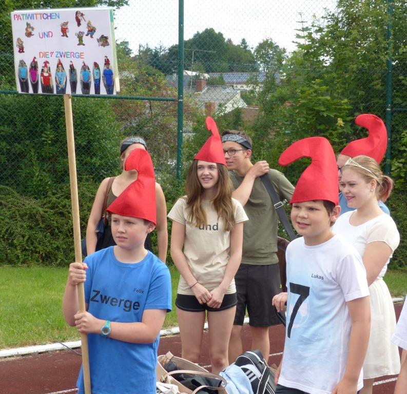 Einen Gänsehaut-Moment erzeugte dann auch bereits der Einmarsch der fünfzig Mannschaften, darunter „Los Albertos“ (mit Sombreros), die „Panzerknacker“ (mit rotem T-Shirt, blauer Schirmmütze und weißen Handschuhen), „Schneewittchen und die sieben Zwerge“ (mit den obligatorischen Mützen), die Super-Helden (mit ihren Helden-Umhängen), das „Aloha“-Team mit seinen Baströckchen und viele weitere, ähnlich fantasievoll ausgestattete Gruppen. Herr Hahnhaußen und die Technik-AG sagten die Gruppen per Lautsprecher an, während hymnische Musik zur olympischen Atmosphäre beitrug und das Doku-Team diesen schönen Tag filmte und fotografierte.