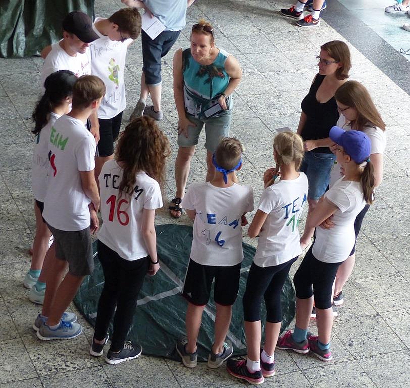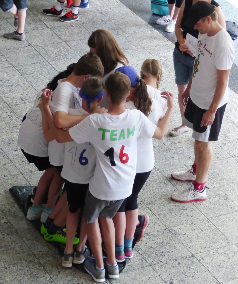 Nachdem die Spiele unter Knallen und Funkensprühen (beigesteuert von der Fachkonferenz Chemie) eröffnet worden waren, ging es an die vierzehn Spielstationen, die teilweise die sportliche Leistungsfähigkeit in den Vordergrund stellten, oft aber nur dann gelöst werden konnten, wenn die Mitspieler einander beistanden und Kleine und Große klug und je nach ihren Kräften miteinander kooperierten.