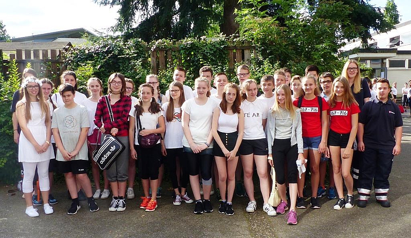 Für die reichlich bereitstehenden Kuchen und Würstchen war angesichts der spannenden Spiele kaum Zeit. Manche verausgabten sich bei dem strahlenden Wetter derart, dass es gut war, dass der Schulsanitätsdienst zur Stelle war und vorher eigens noch einmal eine Übung durchgeführt hatte.