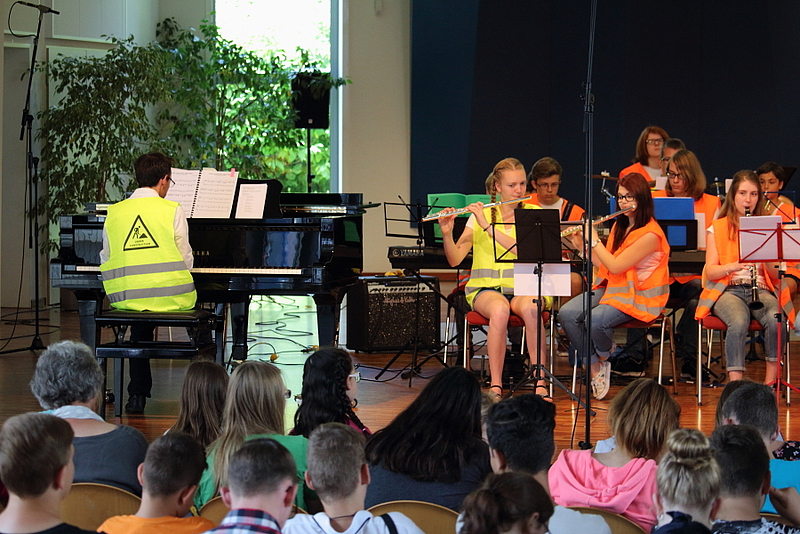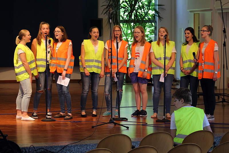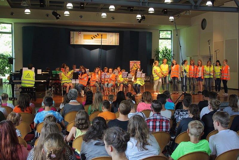 Unter der Leitung von Frank Hahnhaußen lieferten die 9 Sängerinnen sowie die 17 Combo-MusikerInnen einen souveränen Auftritt. Insbesondere die verschiedenen Versionen zum Text „Ich fühle tief in meinem Herzen“ fanden großen Anklang beim Publikum, sodass Moderatorin Eva Molter, Projektleiterin der Landesakademie, als Zugabe „nochmal den Schlager“ hören wollte.