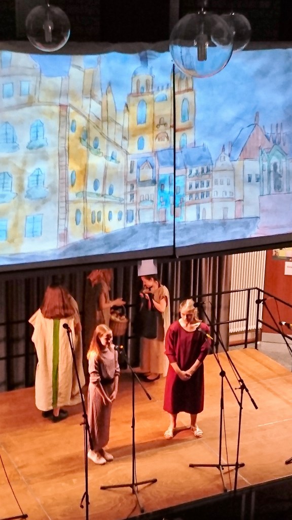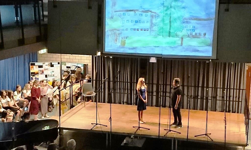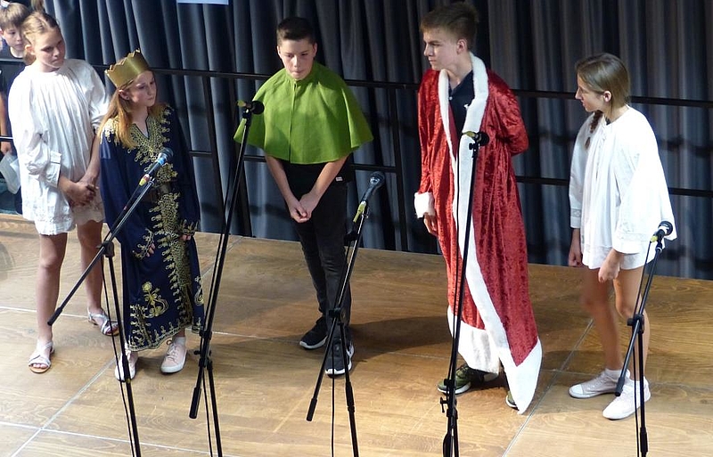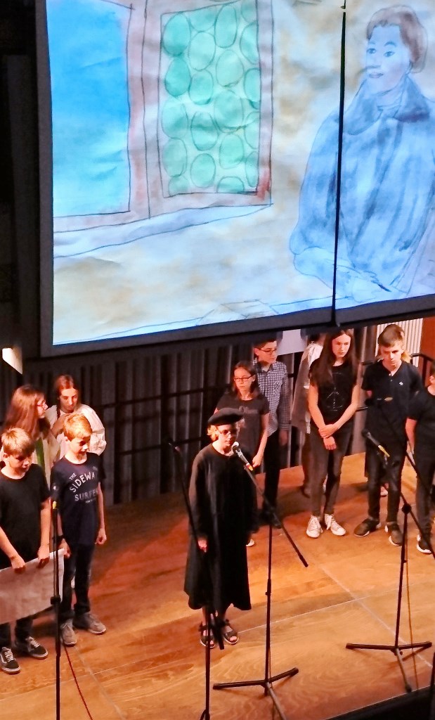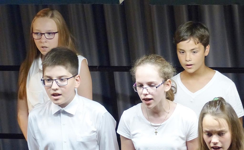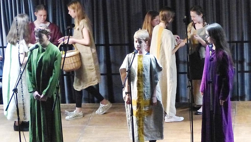 Ein abendliches Konzert boten Unterstufenchor und Chorklasse 6a. Dabei verschaffte der Unterstufenchor unter Leitung von Frau Buchheit dem aufmerksamen Publikum jede Menge "Ohrwürmer". Die Chorklasse 6a mit Herrn Ganster hatte für ihren "Abschiedsauftritt", da das Chorklassenkonzept nach Stufe 6 endet, außer ihrem Musiklehrer noch weitere Kollegen mobilisiert: Frau Fischer hatte für die Kulissen gesorgt, Frau Kerkhoff für die Kostüme, Herr Hahnhaußen übernahm alles, was mit Percussion zusammenhing. So war die Darbietung eines Singspiels zum Thema Reformation, bei dem viele mutige Sängerinnen und Sänger solistische Partien sangen, ein Genuss sowohl für das Auge als auch für das Ohr.