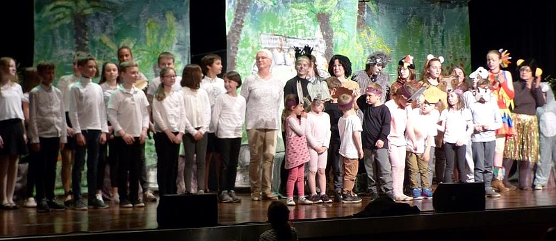 Drei wunderschöne Aufführungen vom "Dschungelbuch" liegen hinter dem Unterstufenchor des AMG unter Leitung von Frau Buchheit, der KiTa Herz-Jesu und dem Biosphärentheater der VHS Hassel. Dabei fand die mittlere Aufführung an einem Vormittag statt, so dass Kindergarten- und Grundschulkinder zu Gast sein konnten. Sie fieberten besonders mit, wenn Tiger Shir Khan seine Krallen ausfuhr und den jungen Mogli angreifen wollte, aber letztlich mit der "roten Blume", also dem Feuer, vertrieben werden konnte. Oder sie lachten herzlich, wenn der gemütliche Bär Balu sich seines Bauches bediente, um Gefahren wegzuboxen und seinem jungen Freund Mogli beizustehen. "Ihr habt so schön gesungen", dieses Lob konnte der Unterstufenchor von ganz vielen begeisterten Zuschauern entgegennehmen.