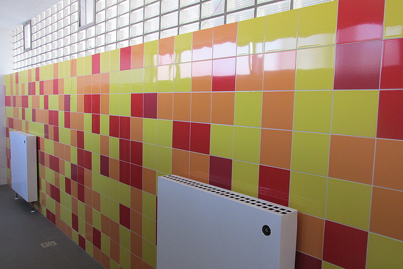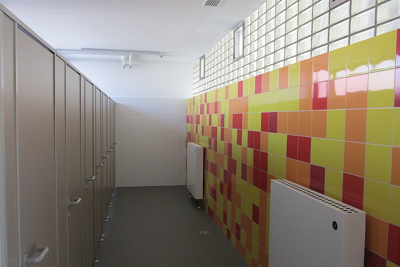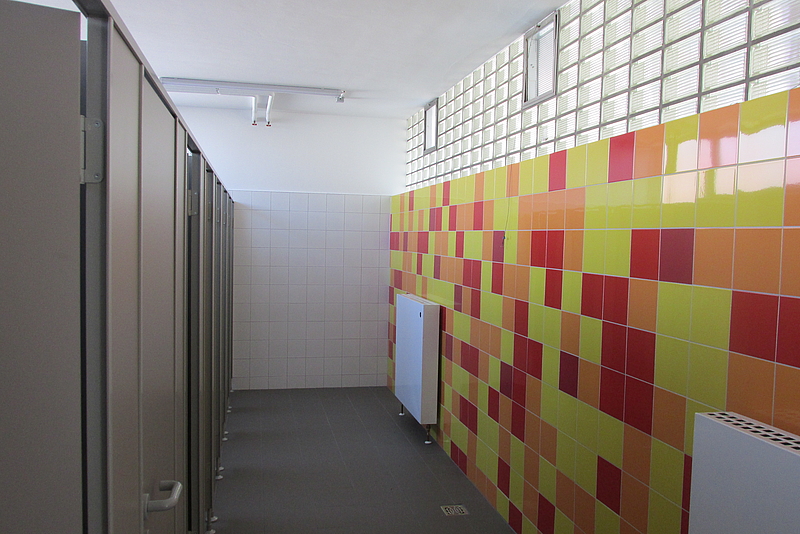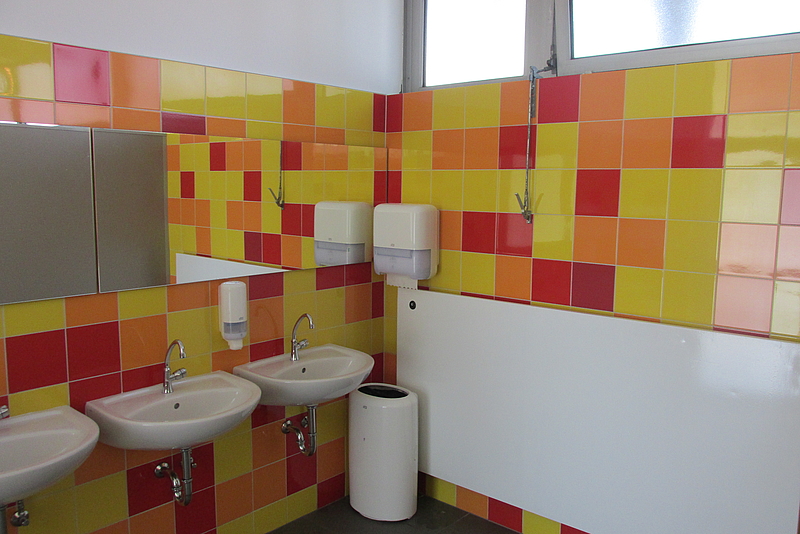 Die neuen Schülertoiletten sind nicht nur neu renoviert, sondern mit ihren bunten Kacheln tatsächlich auch ein Blickfang.
