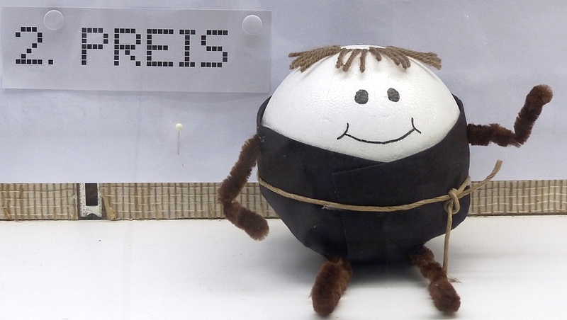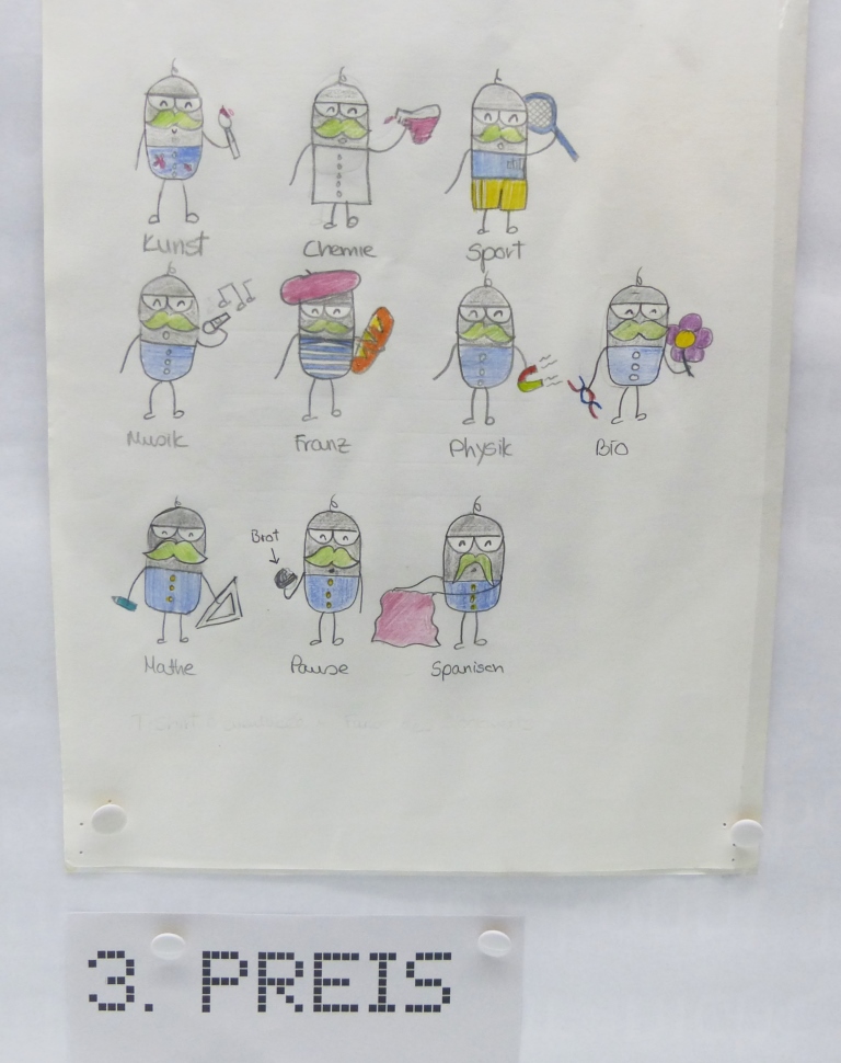 Die spannenden Tage des Wartens waren vorbei, als endlich die Sieger des Maskottchen-Wettbewerbs bekanntgegeben werden konnten. Die Jury - darunter ein Designer, ein Architekt, ein Vertreter des Ministeriums, eine Künstlerin, ein Schülervertreter und natürlich Frau Fischer und Frau Scholz - benötigte mehrere Runden, um aus den 53 eingereichten Entwürfen die drei Preisträger benennen zu können: Tier-Maskottchen, auf den Buchstaben "AMG" beruhende Figuren und auf geometrische Grundformen reduzierte Skizzen waren ebenso dabei wie Ausarbeitungen, die sich an der quadratischen Pixel-Form der Ausschreibung orientierten. Am Entwurf von Clara Dillinger aus Stufe 10 überzeugte vor allem, dass sie bereits vielfältige Varianten ausgearbeitet hatte, um das Maskottchen den verschiedenen Fachbereichen anzupassen; so trug das Maskottchen für das Fach Französisch natürlich Béret und Baguette. Das war einen dritten Preis wert. David Preßmann aus Stufe 7 erreichte mit seiner dreidimensionalen Figur einen zweiten Preis, indem er eine Kugel mit einem sympathischen Gesicht und einer Mönchskutte ausstattete, eine Tonsur aus Wollfäden ergänzte und Pfeifenputzer-Arme hinzufügte. Katharina Bayer aus Stufe 12 erhielt für ihr Bohnen- oder Erdnussmännlein schließlich den ersten Preis, weil die Jury darin etwas Neues und Unverbrauchtes erkannte. Dabei empfahl die Jury, die besten Ideen aus allen drei Preisträgern zu verwenden, um das endgültige Maskottchen daraus zu formen. Darauf freut sich nun die Architektur-AG unter Leitung von Frau Fischer und Herrn Seiler.
